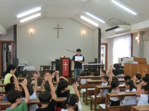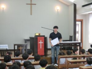 会堂礼拝(2025.10.16) - Category - 日々の活動 会堂にて礼拝をおこないました。 今月の聖句「あなたがたはそれぞれ、賜物を授かっているのです」ペトロⅠ4:10 日下部光喜牧師先生がわかりやすくお話をしてくださいました。子どもたちみんな静かにお話を聞くことができました。